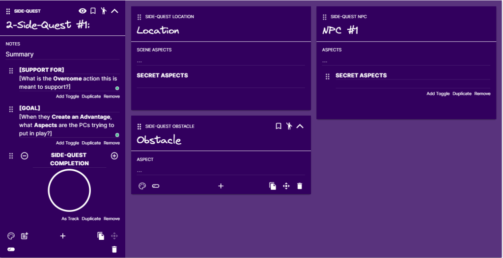 Now, Fig. 4 is just the summary. That’s some structure already, but not nearly enough. Again, we can use sub-cards to structure a side quest and be ready for game day when we need it. All you need is a place, one or two faces, and maybe an obstacle or two to make things interesting. If you want some surprise, add a text block for secret Aspects that the PCs may discover during the side-quest. The minimal structure for a side-quest would look like Fig. 5.