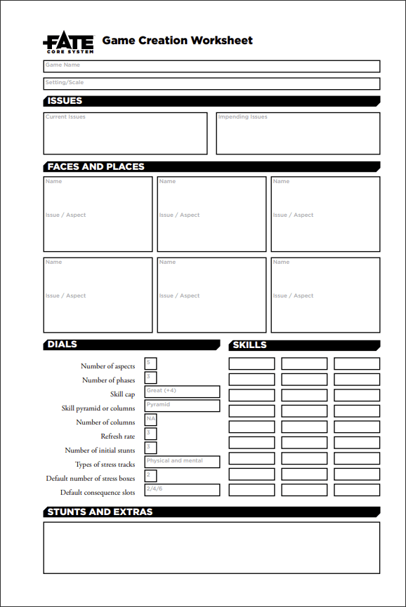 - Quick(ish) game-creation eyeing in the same direction as characters templates, that eases players into the kind of game-table negotiation a good Fate game requires.