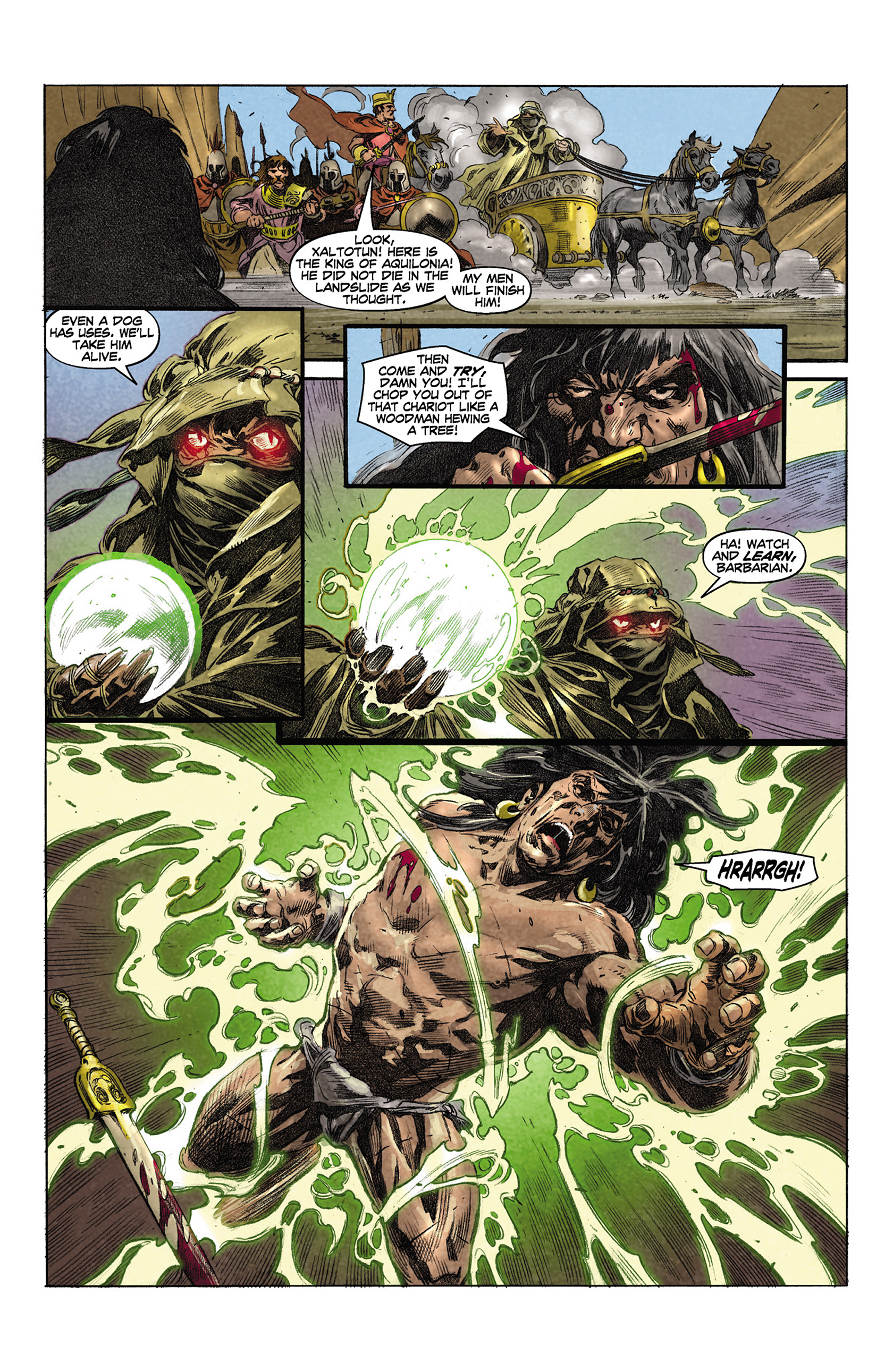 The Minimal Magic System is highly flexible, but can it handle advanced magic? Pick up a Skill (say, Lore), add narrative permission, preferably with setting-related flavor—High Priest of Seth in Python is better than Wizard of Acheron—and that’s Xaltotun, the main antagonist of R.E. Howard’s The Hour of the Dragon. But what of the glistening sphere Xaltotun takes King Conan out with (depicted in the excellent Dark Horse comics King Conan #3, Fig. 1), at the beginning of Chapter 3 of The Hour…?