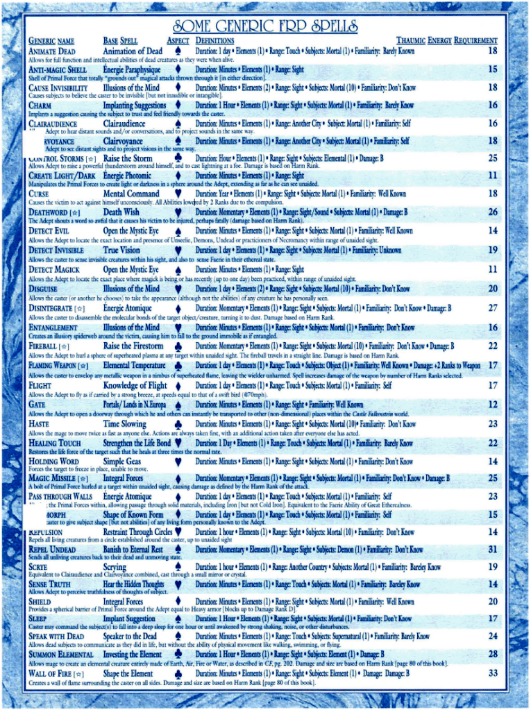 Castle Falkenstein Magick had sort-of schools or domains, a mana system, and a catch-all Sorcery skill, all of which I’ll handwave vigorously because they can cause a shitton of problems (but see The Fine Prints: FATE). Instead, I’ll stick to basic assumptions: Sorcerers have access to spells lists through narrative permission, and spell names indicate their overall effect. There are nominal base costs for spells and, in standard Vancian Magic fashion, free parameters (called “Definitions”) that add to the base cost.