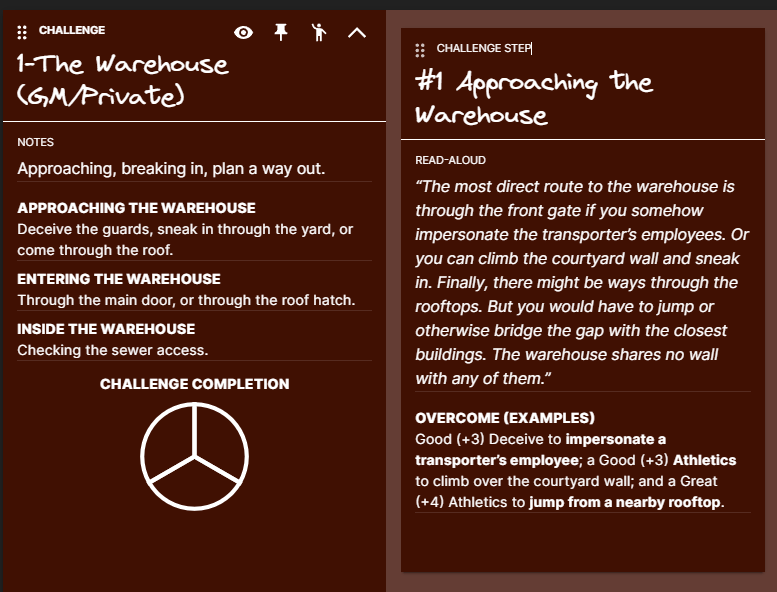 The goal of the not-exactly-a-Challenge and the side-quests you can build out of it is to make the PCs look badass and the players feel awesome. It’s justified narratively—the PCs are consummate professionals—and reflected in difficulty scaling. The reason is that you’re setting them up for a Boss Fight (not included) or some final twist, reveal, and cliffhanger (ditto).