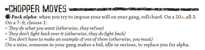 Let’s begin with my favorite move from my favorite Apocalypse World/Fallen Empire playbook, the Chopper’s Pack Alpha—re-skinned as Bloody-Crowned for FE’s Wolfhead—as shown Fig. 1 (or p. 35 in the book; also, p. 187). As a reminder, AW’s dice rolls are 2d6+[stat], and Choppers/Wolfheads start the game with +2 Hard, averaging Pack Alpha at 9 until (at least) their first XP advance.